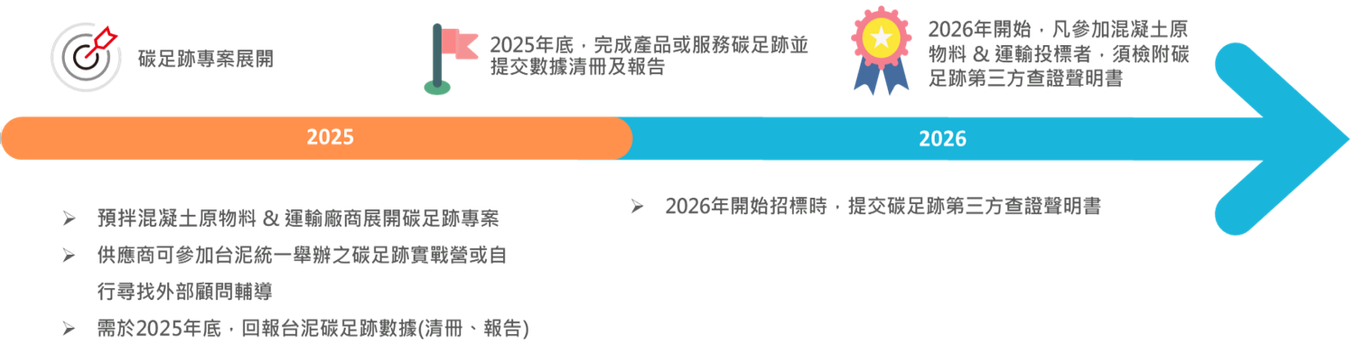 台泥依據採購在地化、綠色化推展供應鏈永續管理機制,持續以高標準擴大檢視供應商 ESG 作為,自 2025 年起預拌混凝土運輸及原料之供應商,需於合約到期前完成 ISO14067 產品或服務碳足跡第三方認證,方得領取標單。作業時程敬請參閱下圖。